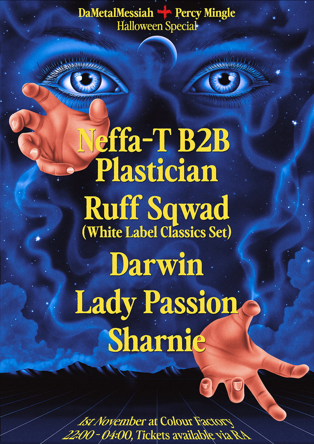 DaMetalMessiah + Percy Mingle: Halloween Special Friday, November 1, 2024 10:00 PM Saturday, November 2, 2024 4:00 AM Google Calendar ICS Buy Tickets DAMETALMESSIAH and PERCY MINGLE reunite for a Halloween party showcasing the full spectrum of bass music.