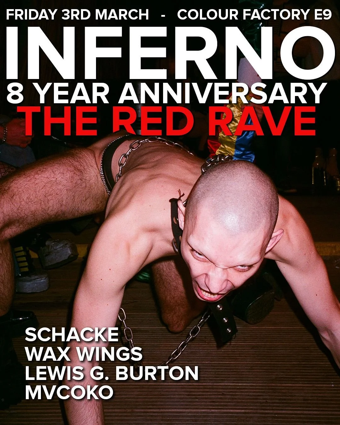 To help us see in this momentous occasion we have SCHACKE coming to play some bangers for us with INFERNO resident WAX WINGS and mother LEWIS G. BURTON as well as welcome MVCOKO with us and more to be announced. We will have all of your favourite hosts there too and a very special performance.