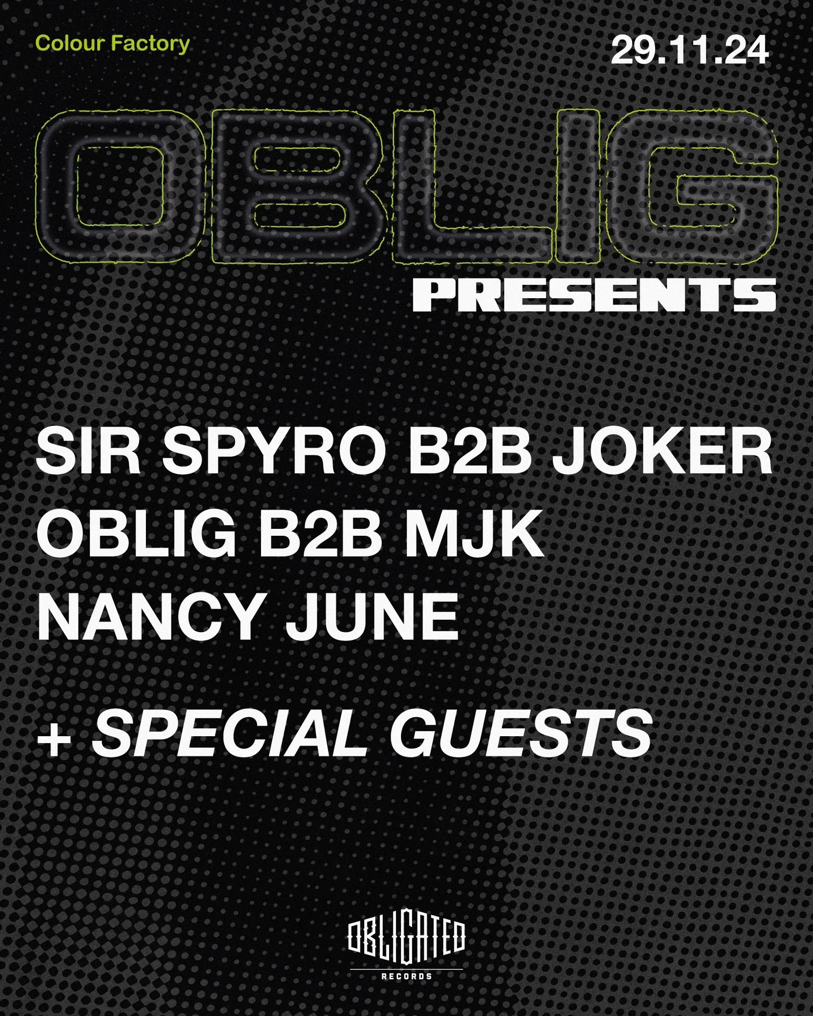 Two absolute legends in visionary grime trailblazer SIR SPYRO and purple dubstep innovator JOKER going head-to-head, with Oblig himself on a back-to-back tip alongside long time co-conspirator and 3-deck wizard, MJK. Multi-genre maven NANCY JUNE rounds things off nicely with a clutch of special guests also primed for the occasion.