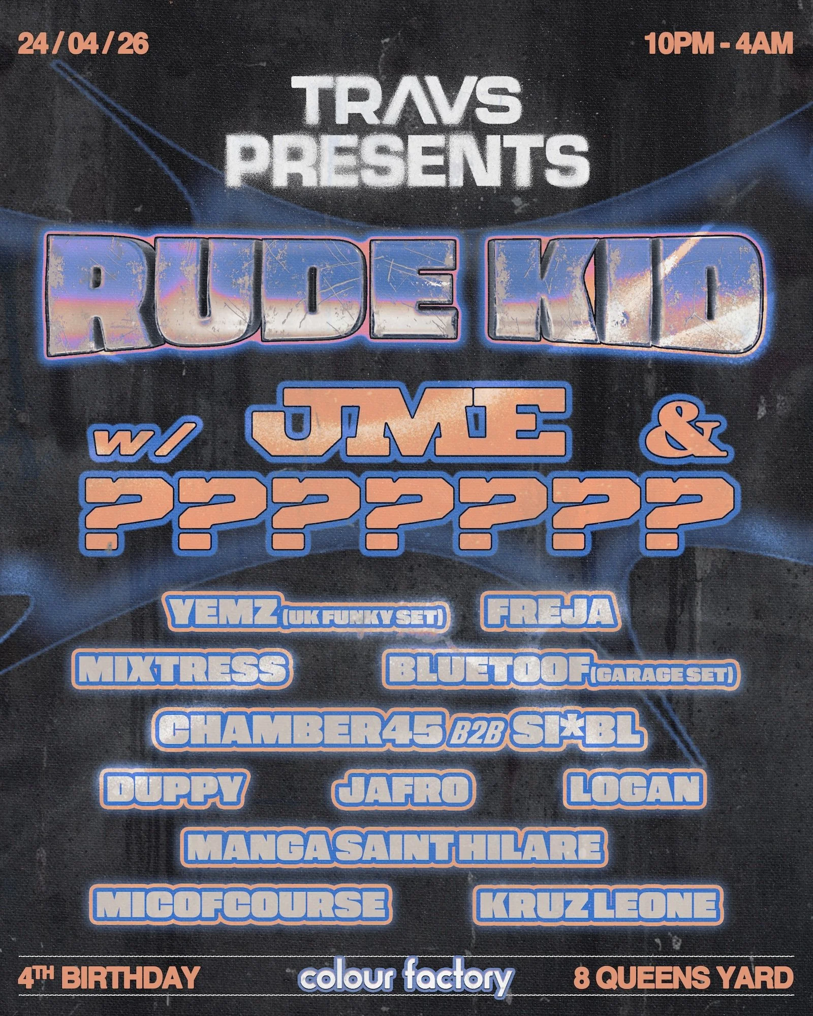 Travs Presents 4th Birthday w/ Rude Kid, JME, ??????, Yemz, Bluetoof Friday, April 24, 2026 10:00 PM 11:00 PM Google Calendar ICS Buy Tickets TRAVS PRESENTS back again at Colour Factory to celebrate their 4th Birthday Party with the maddest lineup yet!