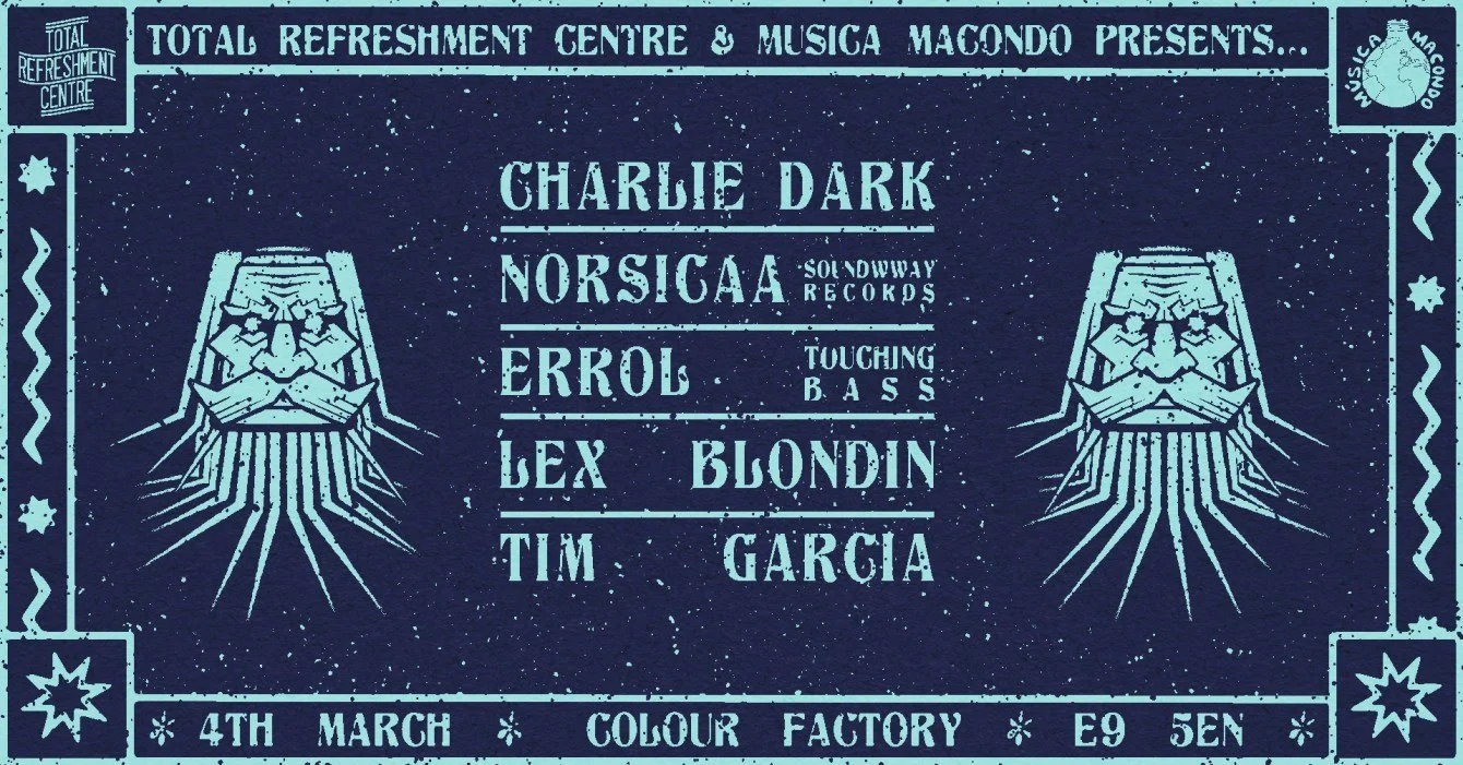 Total Refreshment Centre and Música Macondo link up for the first time since their legendary 2018 NYE Warehouse party, with an unbelievable lineup of DJs - this bill is XXX. Charlie Dark is a modern-day renaissance man, busy being a public speaker, Run Dem Crew founder, poet, community builder, mentor, yoga teacher and host of his show on Worldwide FM. A collector and avid DJ from a young age, we are bringing him down to heat up the dance floor with wicked rare grooves, disco and dub. He’ll get you jogging to the dancefloor with his selections. Australian born, London based DJ and all round music connoisseur Norsicaa is coming down to bring the whole globe to the club floor: tropicalia, afrobeat, calypso, guajira, gogo, cumbia. When she’s not busy running the Soundway Records catalogue, a gold mine for diggers, she brings her eclectic repertoire to her show on Soho Radio. Get ready to jetset.